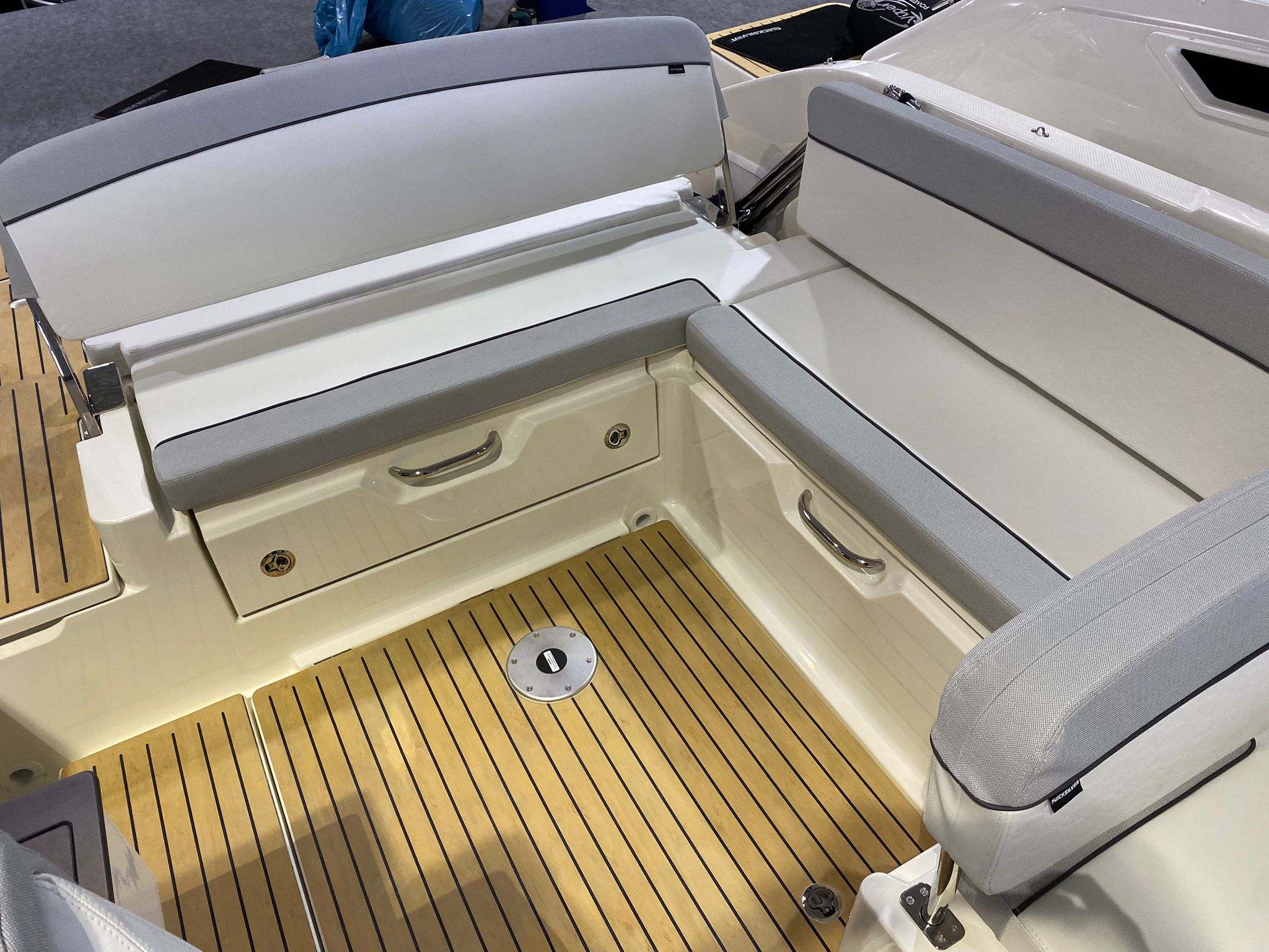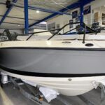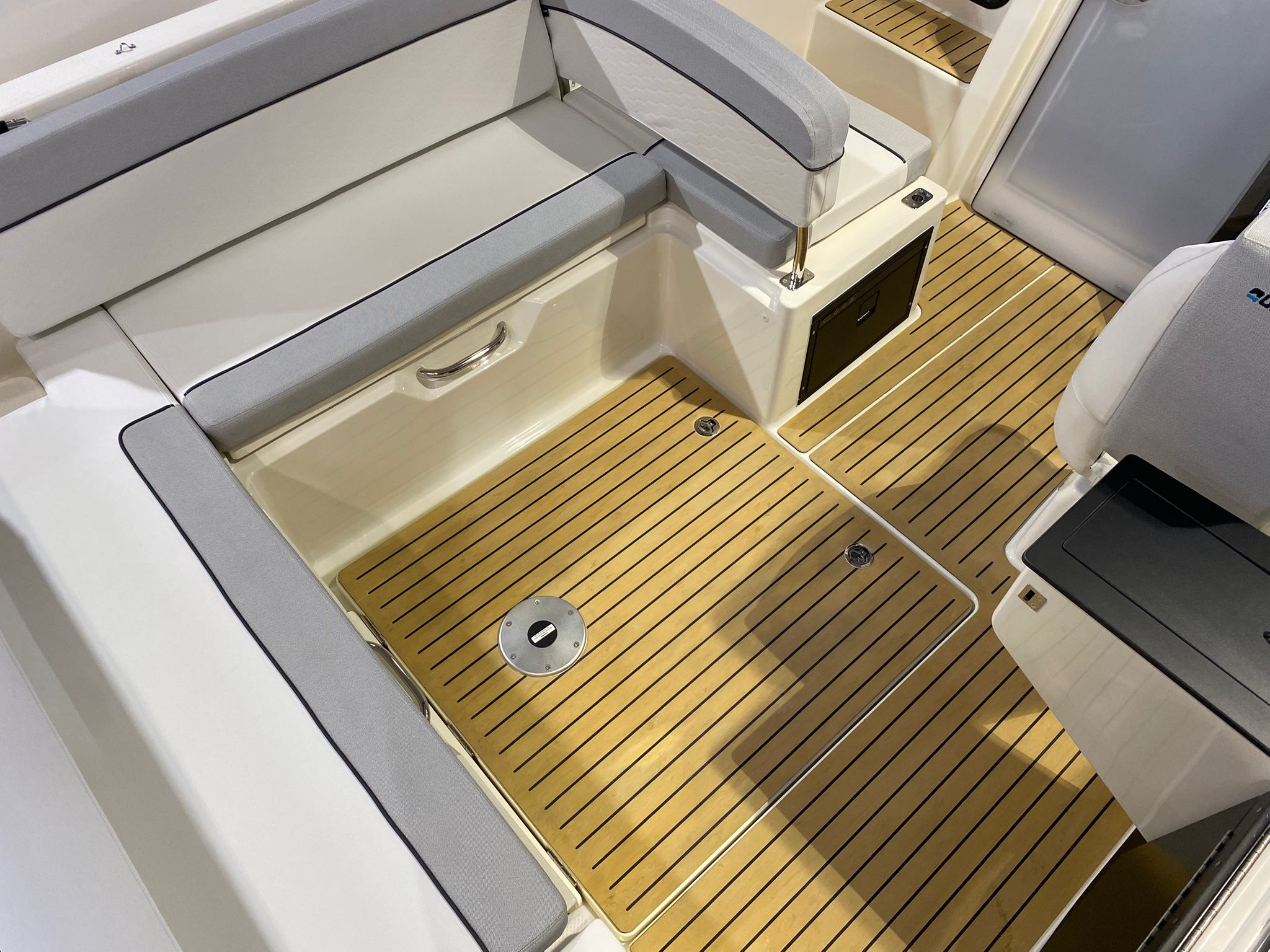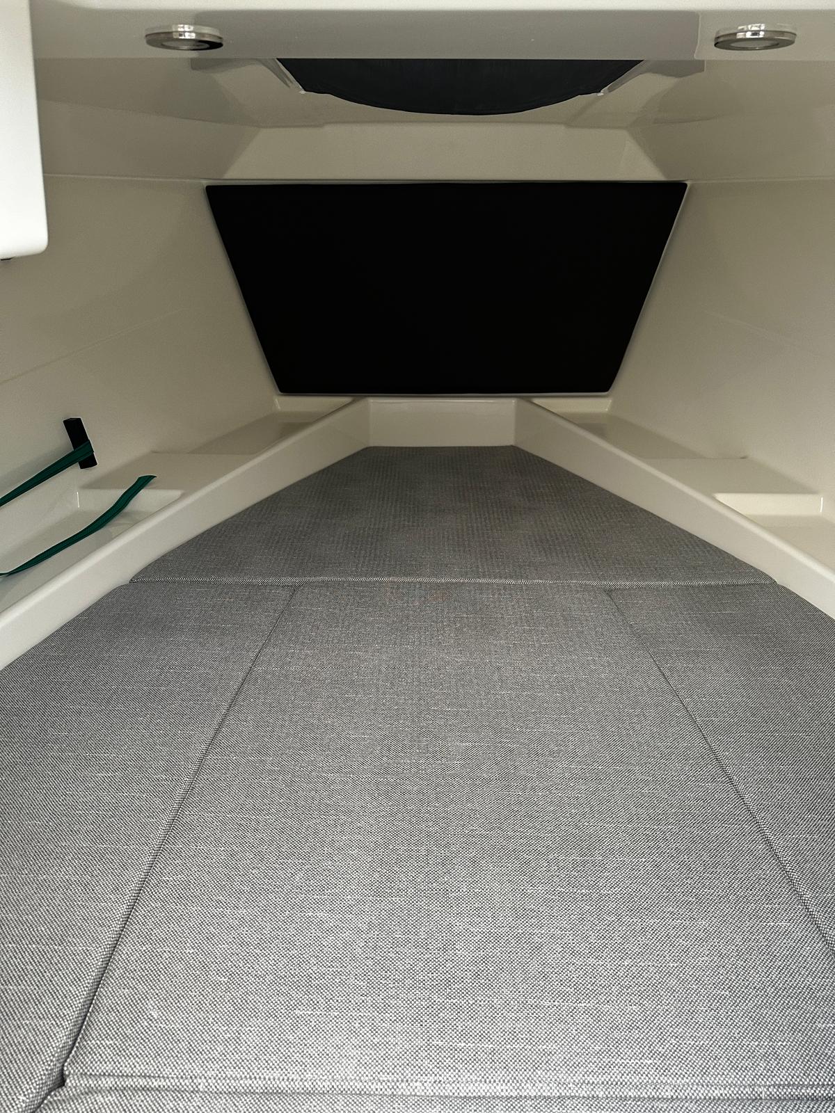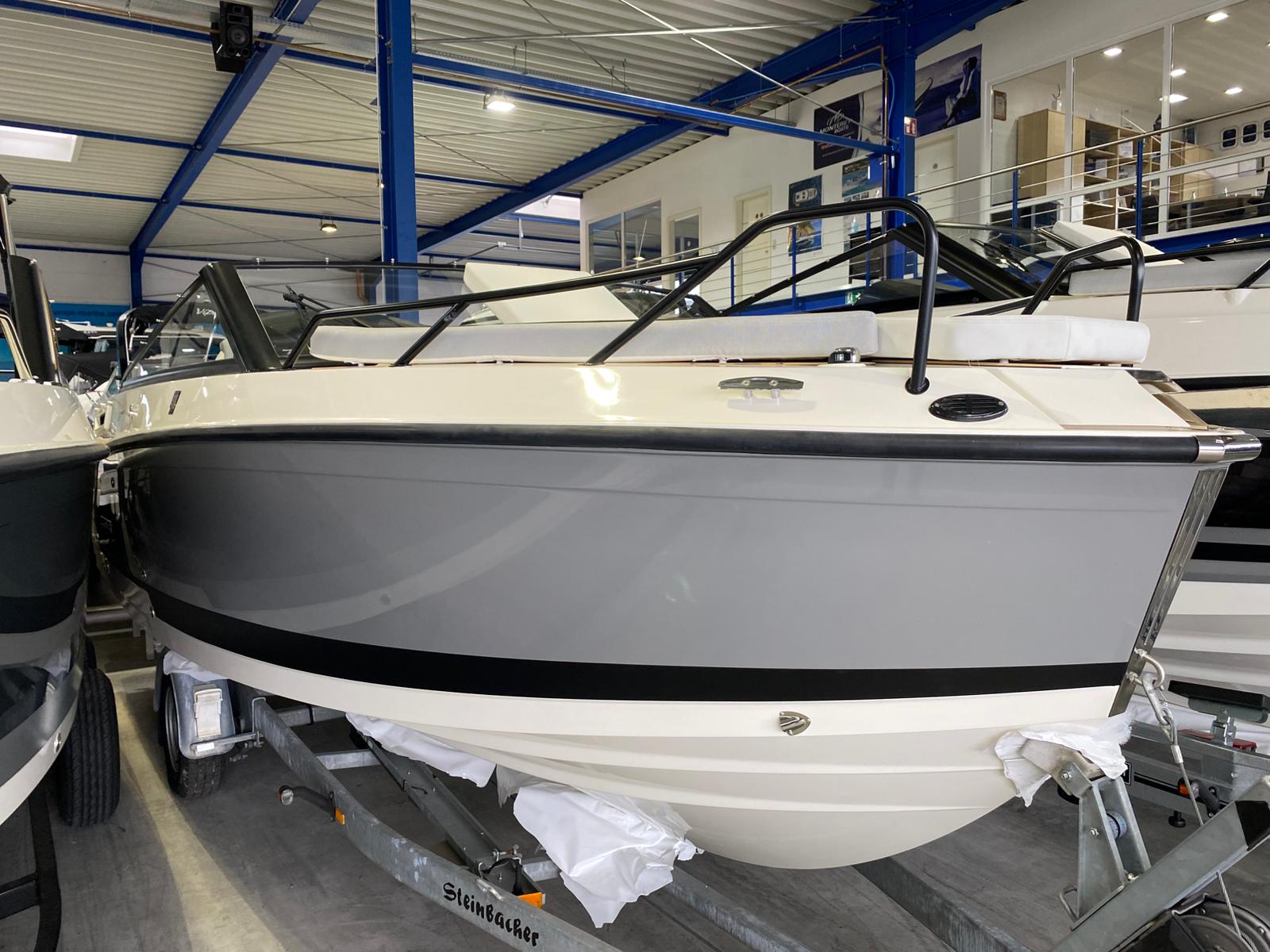 - SMART Edition mit Legacy-Grau Rumpffarbe, weißen & hellgrauen Deluxe-Line Polstern mit Premium Nähten und Flexiteek Bodenbelag: Premium-Grau-Weiß-Stoff mit aufwendigen Nähten, Rumpffarbe (Legacy-Grau), Flexiteek Bodenbelag, LED Innenbeleuchtung, Echter Teak-Cockpit-Tisch, Wasserskimast, Kühlschrank, Cockpit-Dusche, Fusion Stereo mit 2 Lautsprechern, Simrad GPS/Chartplotter Cruise 9 mit HDI Transducer, Cockpit-Sonnenlounge, Mooring Kit