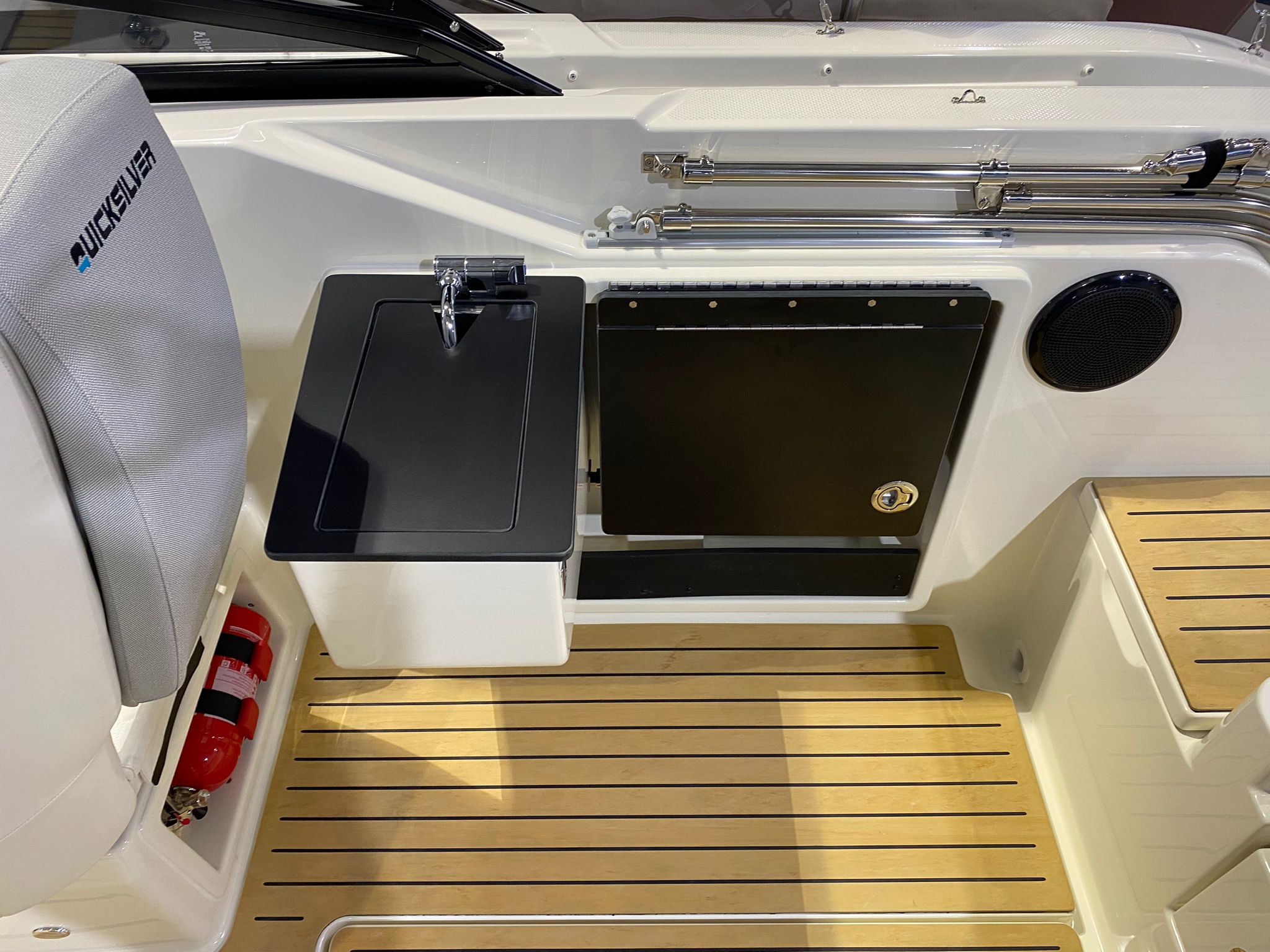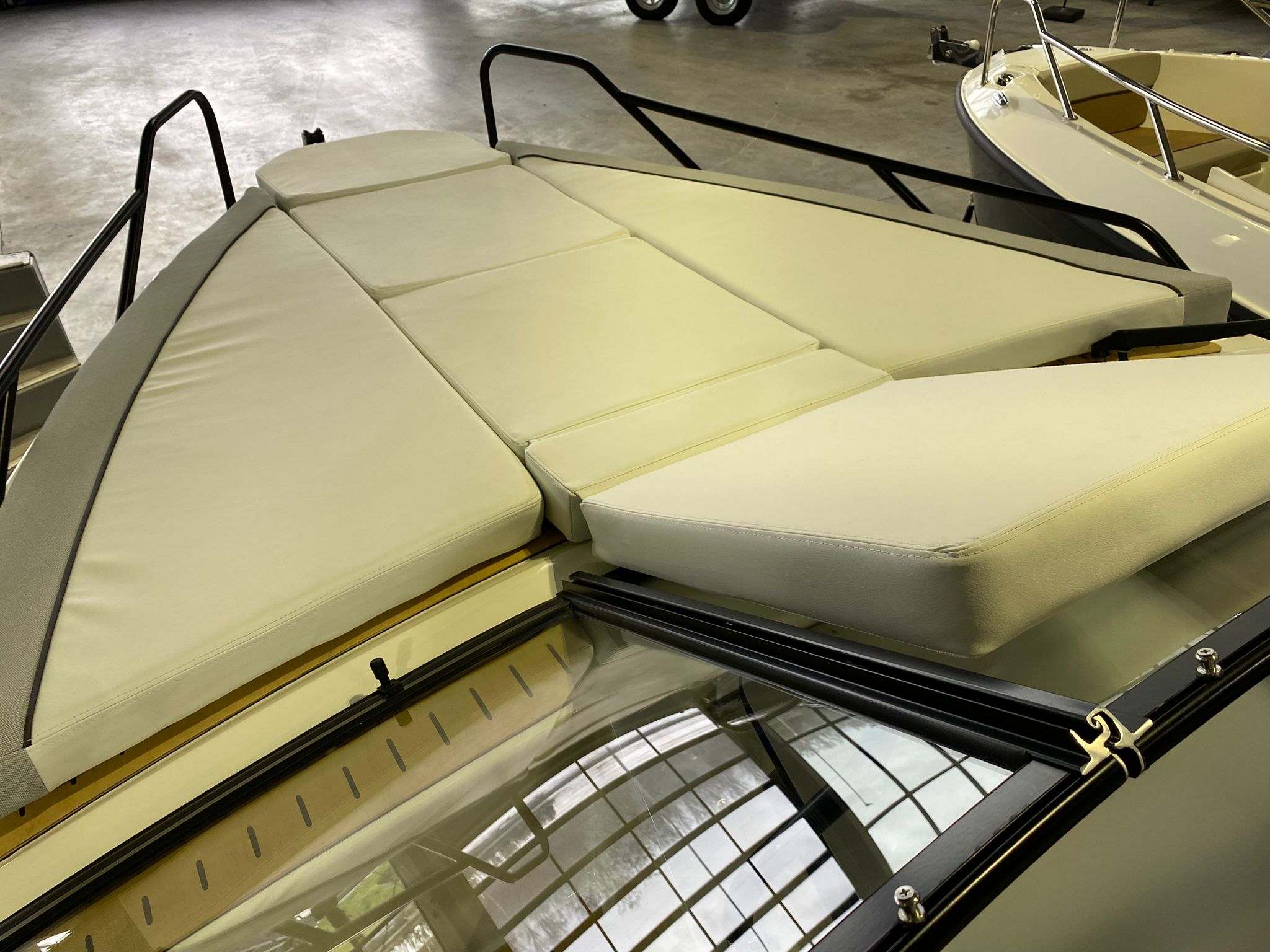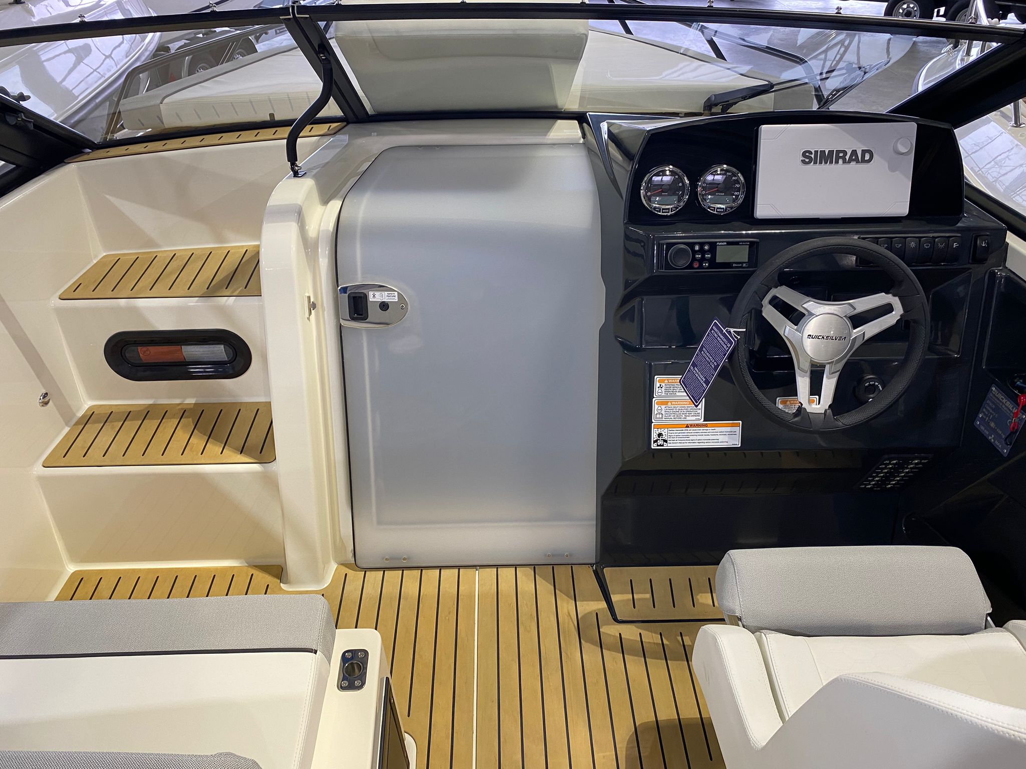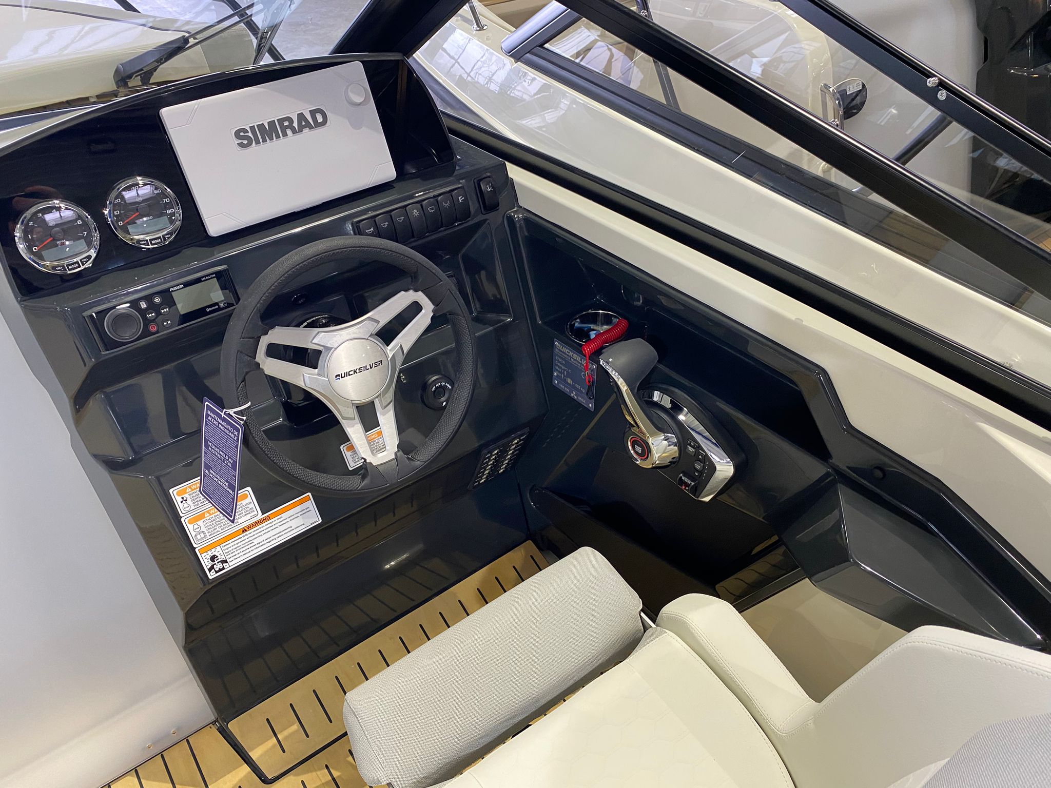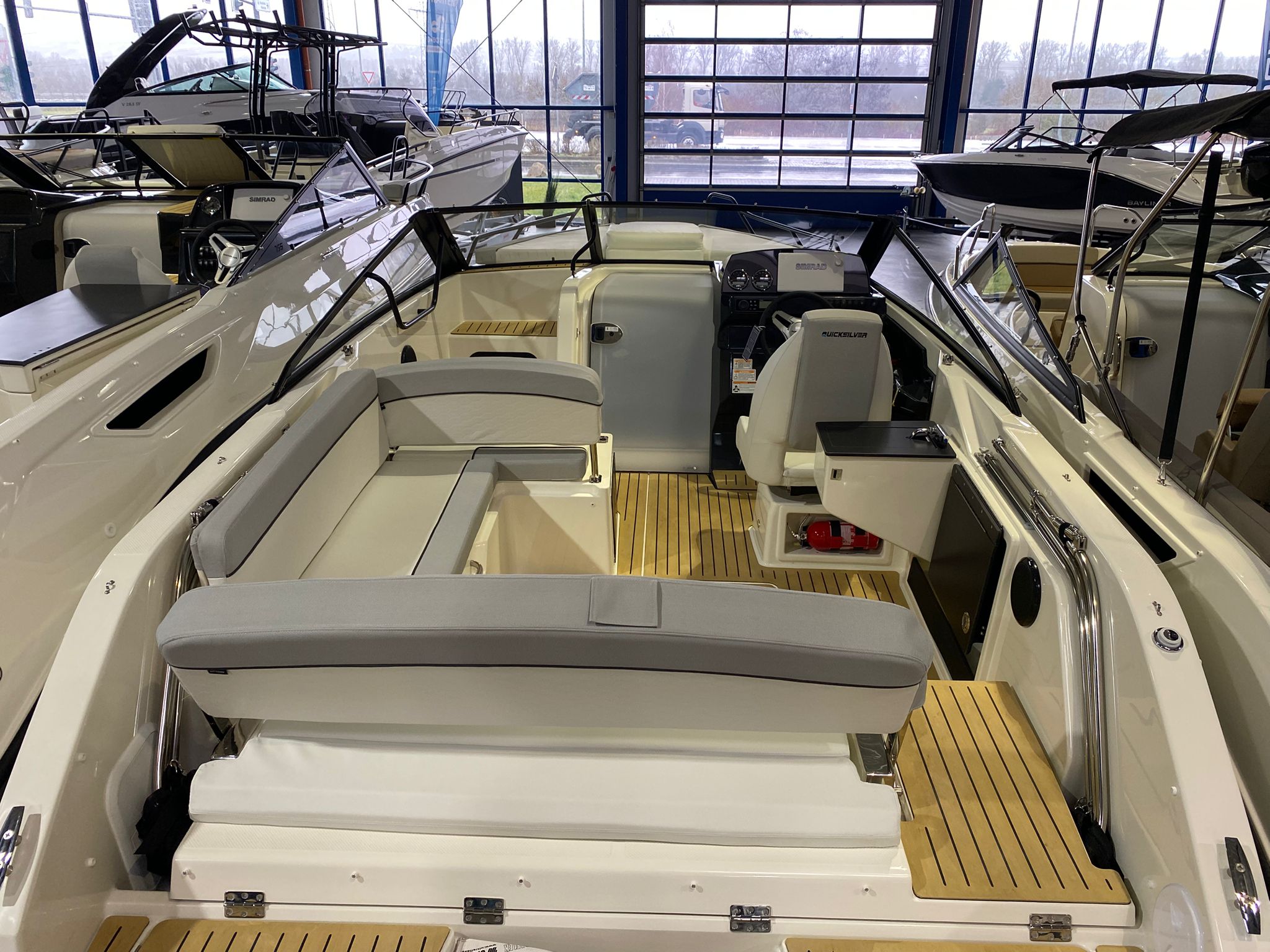 - SMART Edition mit Legacy-Grau Rumpffarbe, weißen & hellgrauen Deluxe-Line Polstern mit Premium Nähten und Flexiteek Bodenbelag: Premium-Grau-Weiß-Stoff mit aufwendigen Nähten, Rumpffarbe (Legacy-Grau), Flexiteek Bodenbelag, LED Innenbeleuchtung, Echter Teak-Cockpit-Tisch, Wasserskimast, Kühlschrank, Cockpit-Dusche, Fusion Stereo mit 2 Lautsprechern, Simrad GPS/Chartplotter Cruise 9 mit HDI Transducer, Cockpit-Sonnenlounge, Mooring Kit